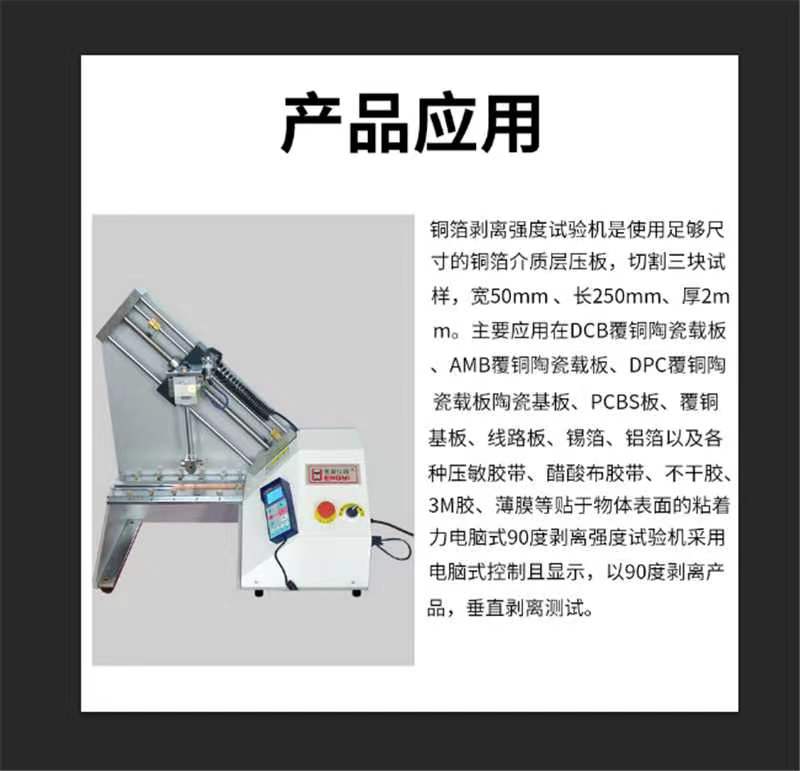 衡翼銅箔抗撕裂強(qiáng)度試驗機(jī)用于測試覆銅層壓板和印刷線路板工業(yè)的試驗室中測量剛性板上銅箔或者柔性板上銅箔的抗剝離力、剝離強(qiáng)度、平均剝離力、平均剝離強(qiáng)度等。銅箔剝離強(qiáng)度試驗機(jī)是使用足夠尺寸的銅箔介質(zhì)層壓板,切割三塊試樣,寬50mm 、長250mm、厚2mm。主要應(yīng)用在DCB覆銅陶瓷載板、AMB覆銅陶瓷載板、DPC覆銅陶瓷載板陶瓷基板、PCBS板、覆銅基板、線路板、錫箔、鋁箔以及各種壓敏膠帶、醋酸布膠帶、不干膠、3M膠、薄膜等貼于物體表面的粘著力電腦式90度剝離強(qiáng)度試驗機(jī)采用電腦式控制且顯示,以90度剝離產(chǎn)品,垂直剝離測試。